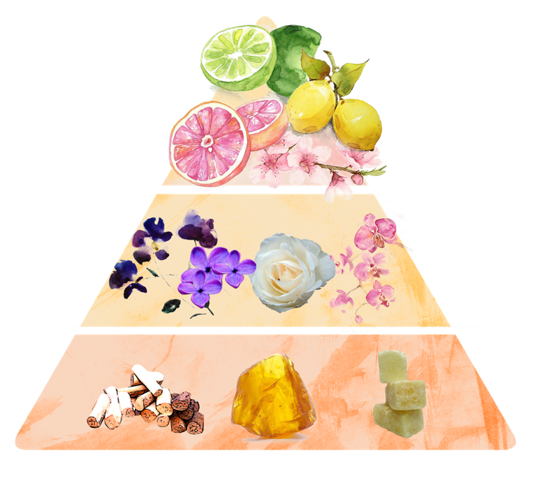 보통 향기피라미드라 불리는 프래그런스 피라미드(Fragrance Pyramid)는 향수의 향을 구조적으로 이해하고 설명하는 데 사용되는 중요한 개념이며, 세 가지 주요 단계인 탑노트 (Top Note), 미들노트 (Middle Note), 베이스 노트(Base Note)로 구성됩니다. 이 피라드 모델은 시간이 지남에 따라 향수의 향기가 어떻게 변하는지 시각적으로 표현하고 있으며, 사요 자가 향수를 선택하는데 도움을 줍니다. 프래그런스 피라미드의 기원은 19세기말 20세기 초로 거슬러 올라가며 프랑스에서 현대적 향수 제작 체계화가 잡혀가며 널리 사용되기 시작했습니다. 이 시기에는 화학 기술의 발전과 합성재료들이 증가하며 복잡하고 구조화된 향기 구성이 가능해졌습니다.